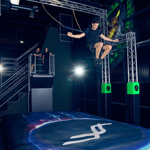 3 postazioni di trampolini elastici di varie metrature per rincorse diverse ed inclinazioni diverse di spinta ed una postazione su piattaforma più alta e fissa. Tutte tali postazioni hanno atterraggio su materasso gonfiabile di tipo Airbag dotato di motori soffiatori che lo rendono sospeso e fluttuante.