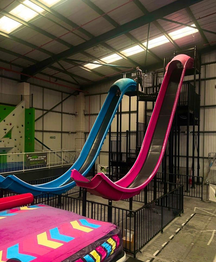 Sali su di un ripiano superiore percorrendo la scala a chiocciola, poi scendi sullo scivolo per atterrare, dopo fase di volo, su di una piscina sottostante riempita con cubi di spugna.